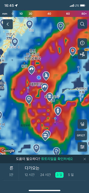 이 날씨에 앱을 이용하여 6월 30일의 날씨와 그 다음 주의 날씨도 예상할 수 있게됩니다. 태풍이 생성되는 시점이고, 태풍이 이동하는 거리와 속도를 고려해본다면, 7월 첫째주 후반에는 한반도에 태풍의 영향이 있을 듯하다고 판단됩니다.
